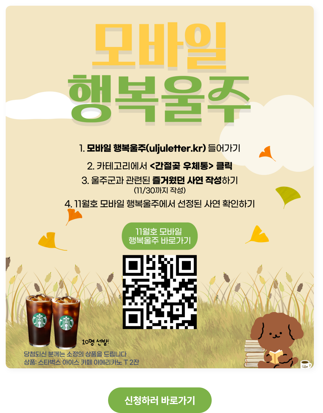 10월의 사연10월 한 달간 울주군과 관련된 즐거웠던 사연을소개하는 이벤트를 진행하였습니다.당첨된 분들 모두 축하드립니다.