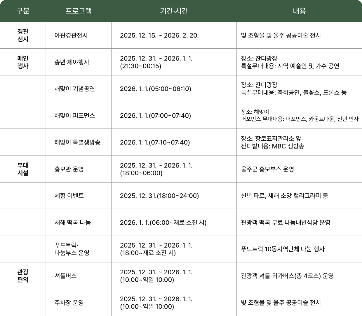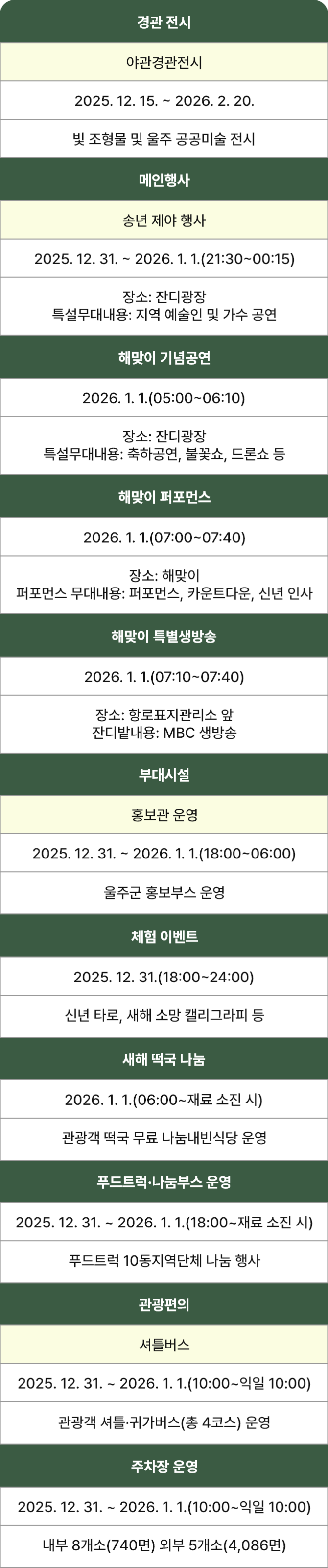 행사장을 찾은 이들이 편안하게 머물 수 있도록 부대시설도 충분히 마련된다. 울주군 관광 홍보관, 농특산물 부스, 마을기업 홍보관 등이 운영되며, 새해 아침에는 따뜻한 떡국이 무료로 제공되어 많은 이들에게 작은 응원 같은 시간을 선물한다. 또한 행사 기간 동안에는 여러 곳에 주차 공간이 확보되고, 셔틀버스와 귀가버스가 운영되어 이동도 원활하게 지원된다.